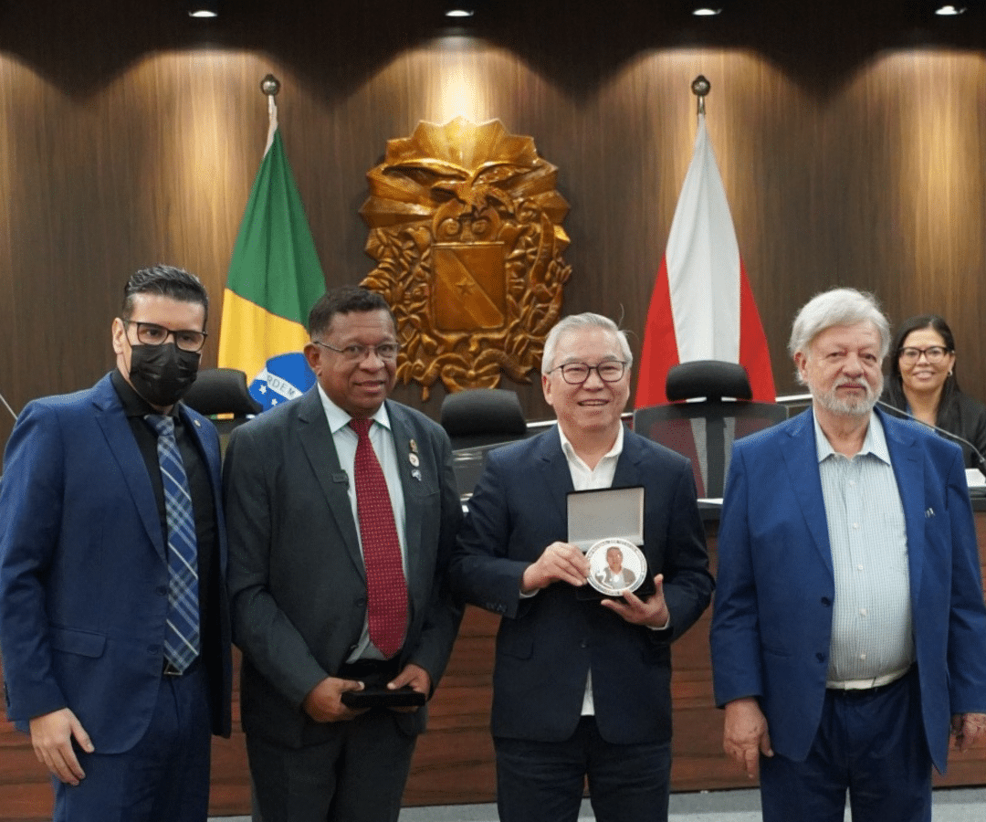 Sessão solene na ALEPA presidida pelo deputado estadual, Fábio Freitas; ao lado, presidente do CRT-SP, Gilberto Takao Sakamoto, é homenageado pela FENTEC