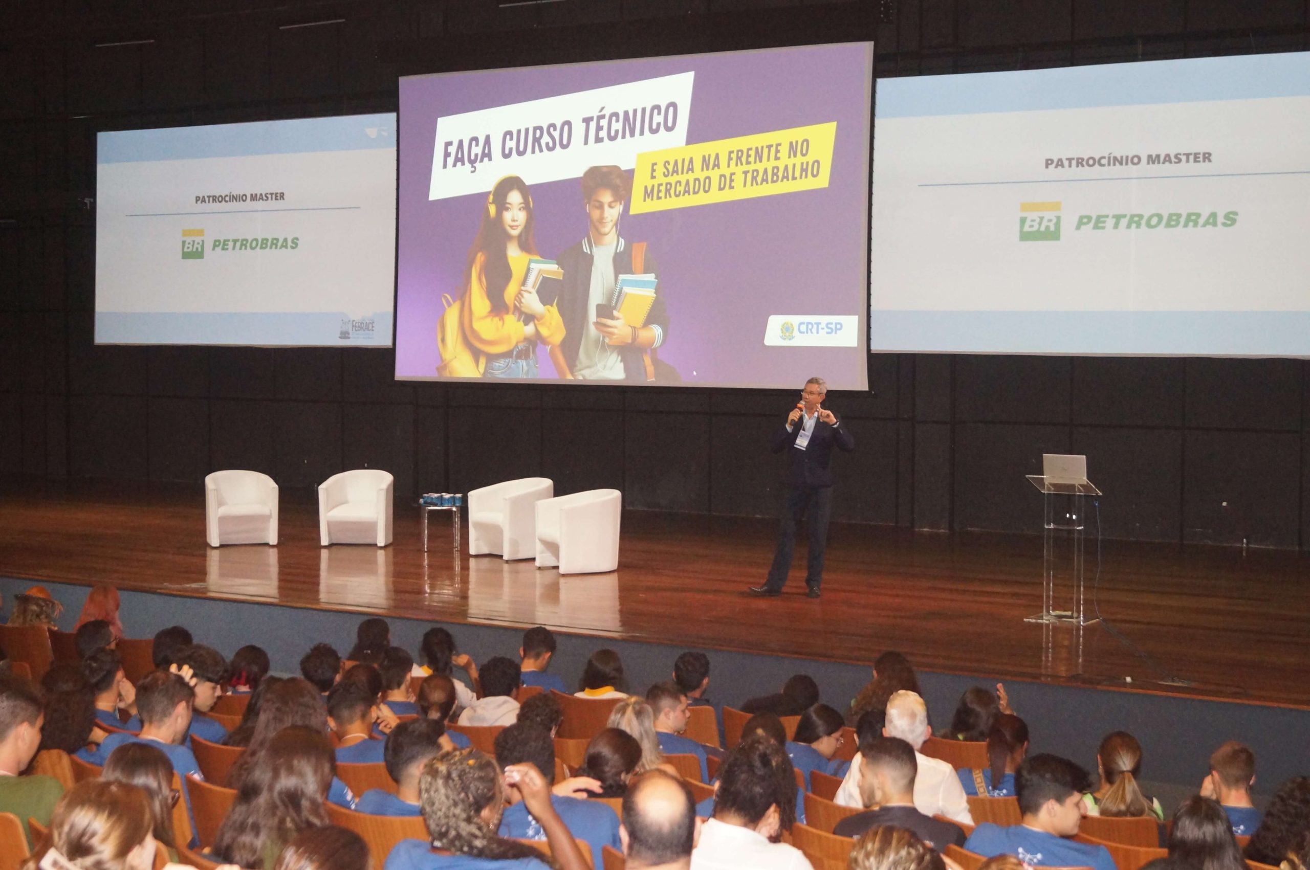 Faça curso técnico! – Diretor administrativo do CRT-SP, Welington Guilherme Rezende ministrou a palestra “A Importância da Formação Técnica” para um auditório repleto de alunos e orientadores, explanando sobre as vantagens de fazer cursos técnicos, com opções em mais de 90 modalidades diferentes – eletrotécnica, mecânica, edificações, entre tantas outras –, que geram oportunidades em praticamente todos os setores e – no ambiente da 22ª FEBRACE – incentivam a criatividade e a inovação. “É a forma mais eficaz de aprender coisas práticas e específicas sobre uma profissão que você tem interesse”, traz a apresentação. E outra: comprovadamente, o curso técnico é o caminho mais curto para o mercado de trabalho formal; pois, as pesquisas indicam que os profissionais com formação técnica têm 81% mais chances de conseguir emprego.