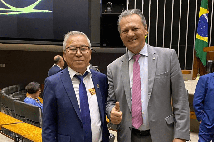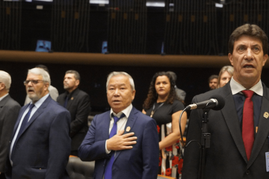 Plenário Ulysses Guimarães lotado e, ao lado, Gilberto Takao Sakamoto com o proponente, deputado federal Giovani Cherini
