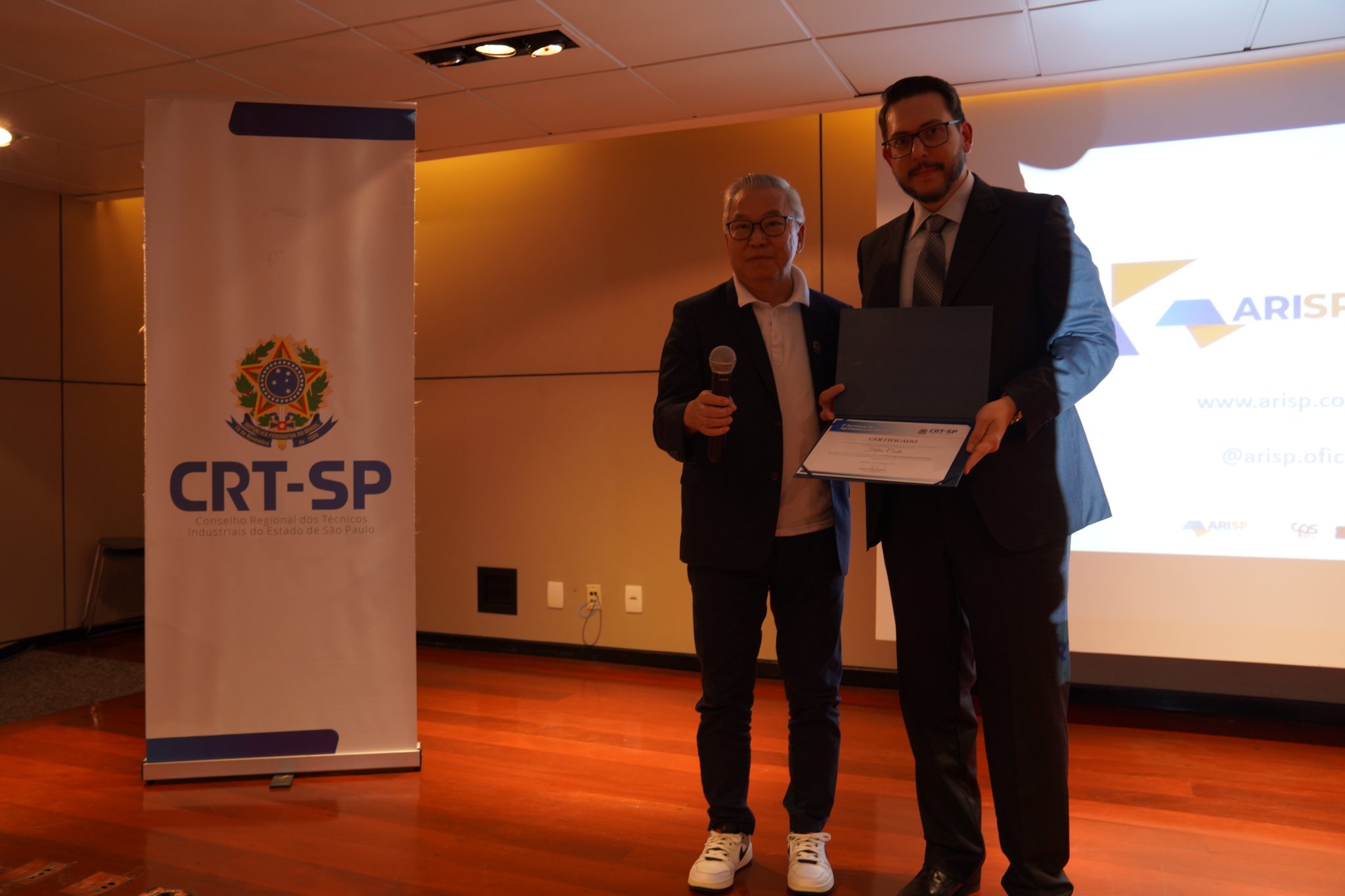 Fábio Costa: palestrante recebe certificado de participação do presidente, Gilberto Takao Sakamoto