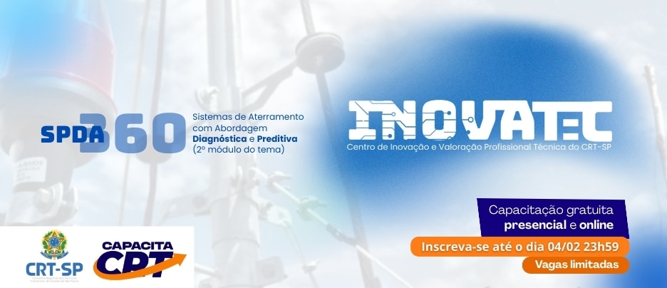 Por meio do Capacita CRT, programa de capacitação desenvolvido pelo Conselho Regional dos Técnicos Industriais do Estado de São Paulo (CRT-SP), acontece, no dia 6 de fevereiro de 2026, às 14 horas, no Centro de Inovação e Valoração Profissional Técnica (INOVATEC), localizado nas dependências do Parque de Inovação Tecnológica São José dos Campos (PIT SJC), o Capacita CRT: “SPDA 360 – Sistemas de Aterramentos com Abordagem Diagnóstica e Preditiva”. A capacitação será ministrada pelo Técnico em Eletrotécnica, Kleber Veloso, sócio proprietário do Grupo Elétrica, suplente de conselheiro e representante do CRT-SP na Associação Brasileira de Normas Técnicas (ABNT).