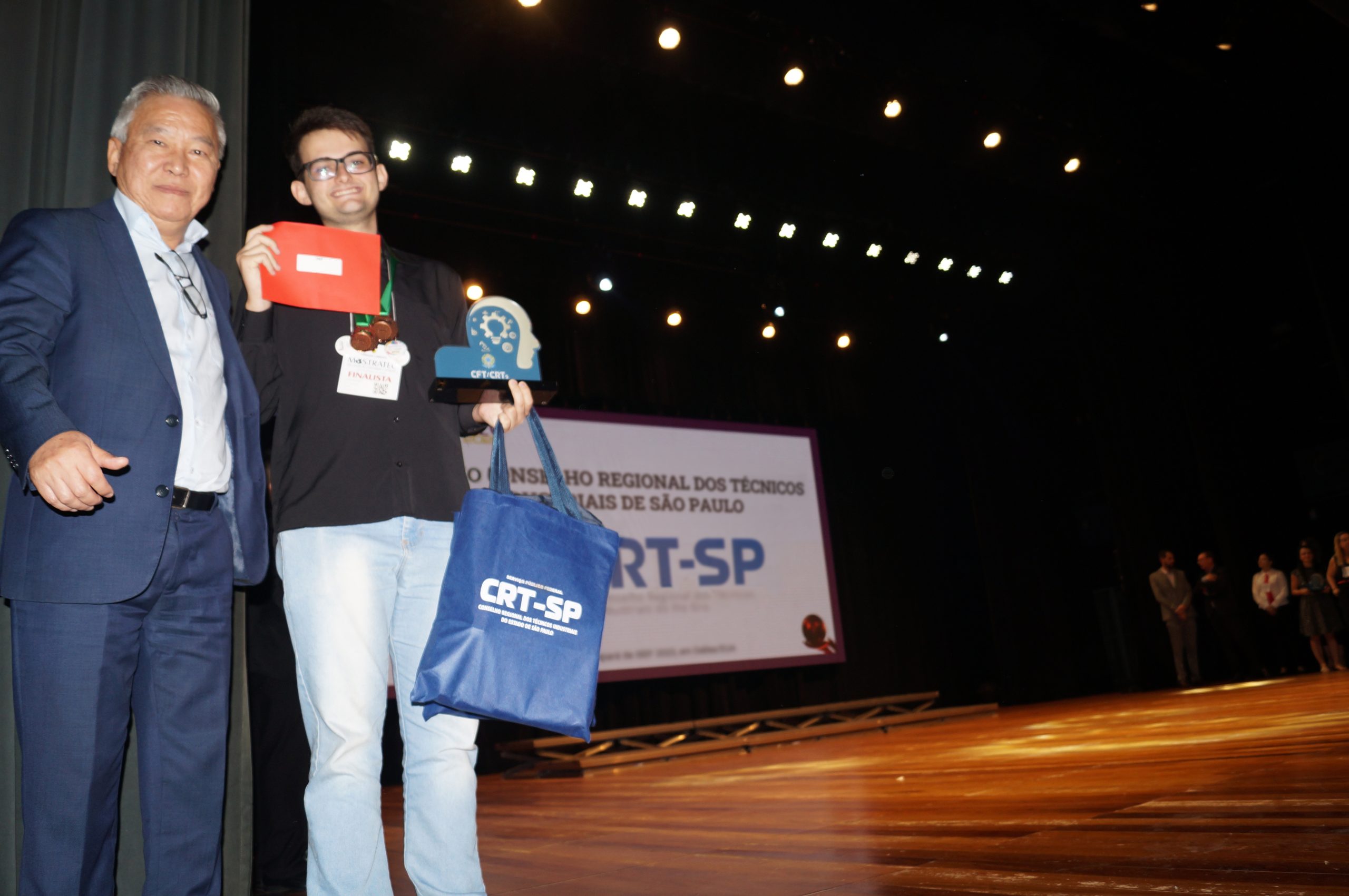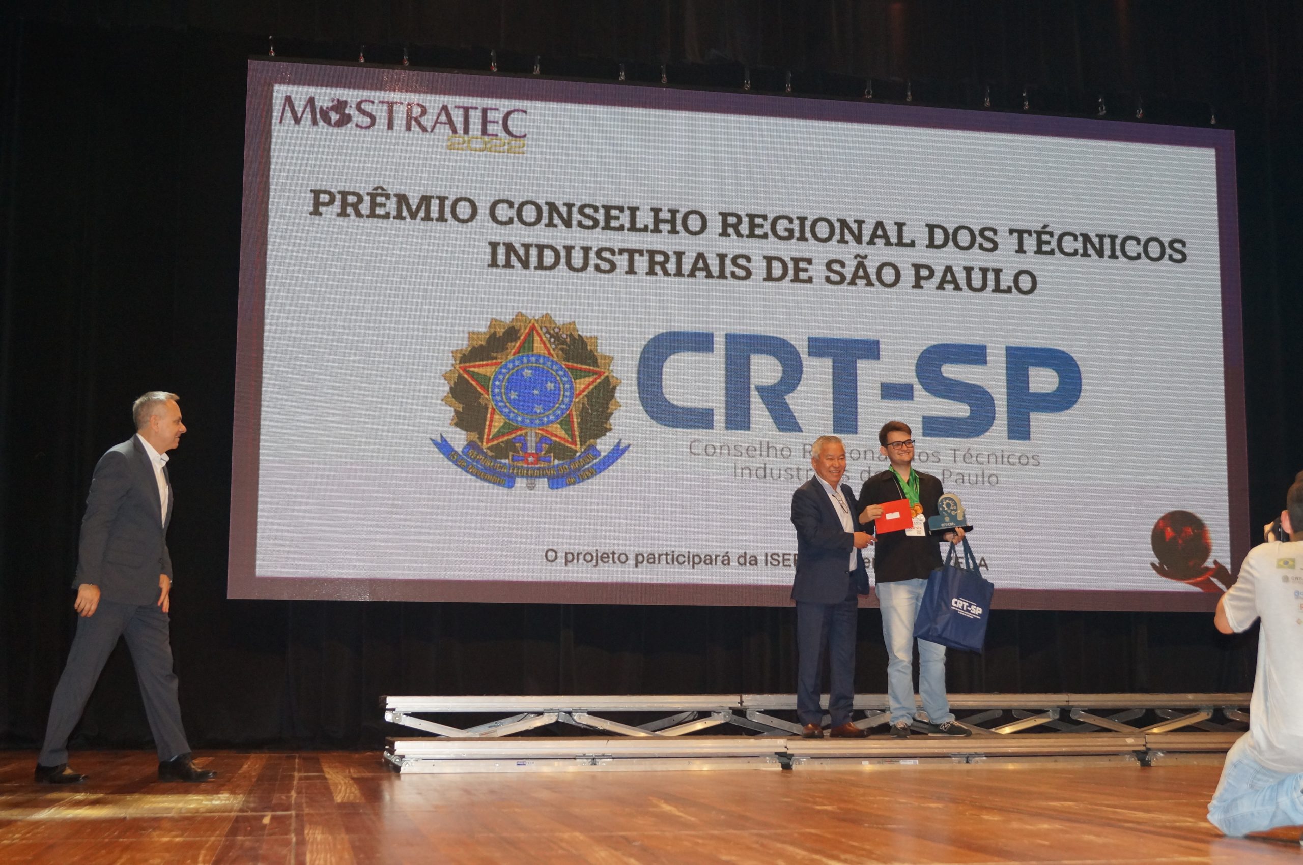 Para o CRT-SP, no entanto, o que mais chamou a atenção – também por se tratar de um projeto estritamente de ordem técnica – foi o dispositivo microcontrolado para cálculo de áreas, de autoria dos alunos Paulo Sergio Neves Regatieri, Gustavo de Carvalho Guimarães e Paulo Cesar Murata Filho, do curso técnico em eletrônica no Instituto Federal de São Paulo (IFSP) de Campinas, sob orientação do professor Edson Anício Duarte. Em resumo, é um equipamento portátil para calcular áreas irregulares com o intuito principal de auxiliar obras e projetos de construção civil com suporte para outras áreas adjacentes. “As premiações oferecidas por instituições parceiras e apoiadores possuem critérios estabelecidos por eles próprios”, comunicou o cerimonial antes de chamar ao palco os representantes das entidades apoiadoras; entre eles, Gilberto Takao Sakamoto, presidente do CRT-SP, que patrocinará a participação do projeto na International Science and Engineering Fair (ISEF) que acontece em Dallas, Estados Unidos, no mês de maio de 2023. Os próximos passos serão de alinhamento da parceira entre o CRT-SP e o IFSP de Campinas.