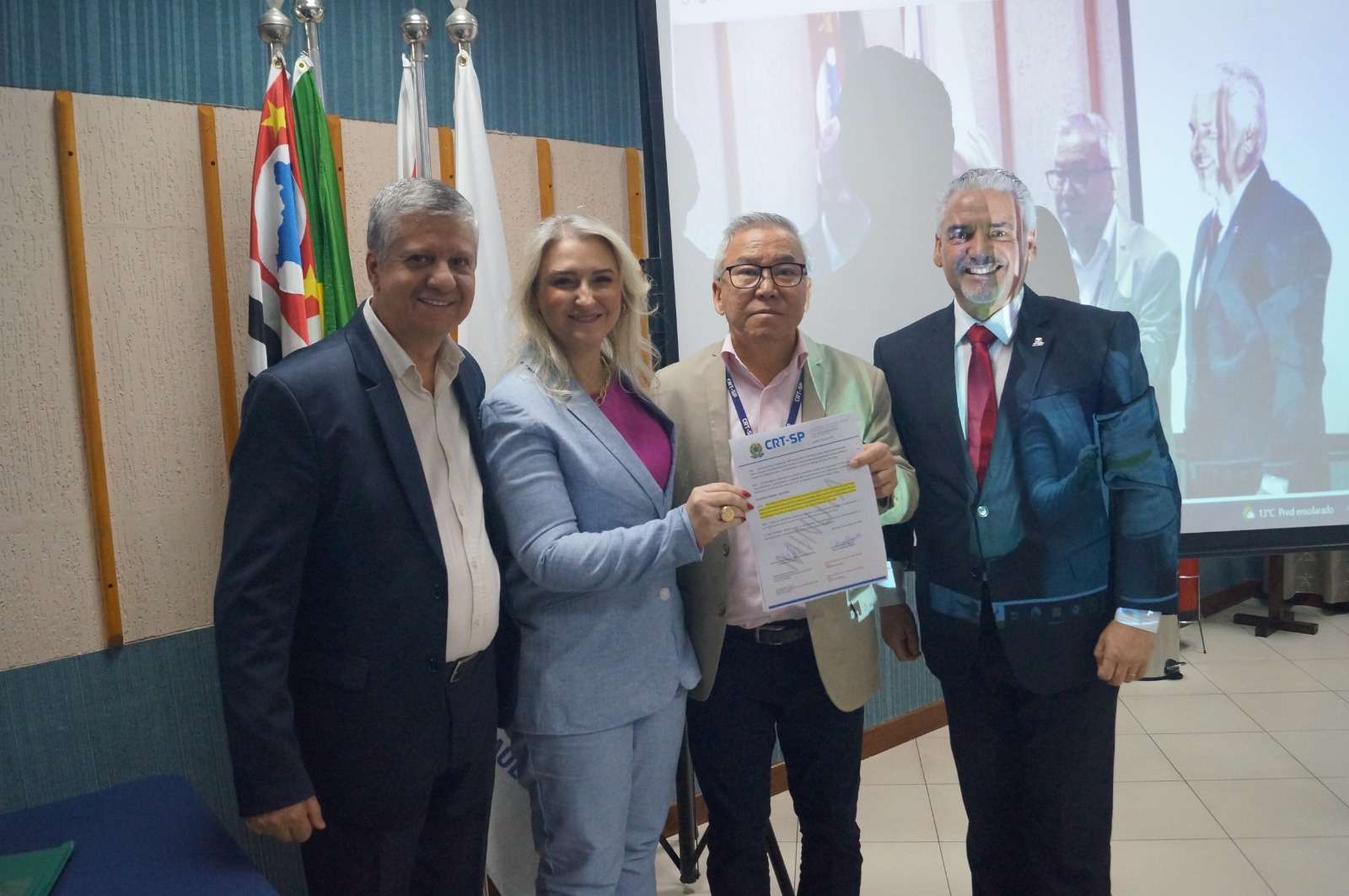 Gilberto Takao Sakamoto e Flávia Augusto assinam termo de cooperação técnica; na imagem, também o diretor executivo do CRC-SP, Cláudio Rafael Bifi, e o gerente de departamento técnico do CRT-SP, Rubens de Campos