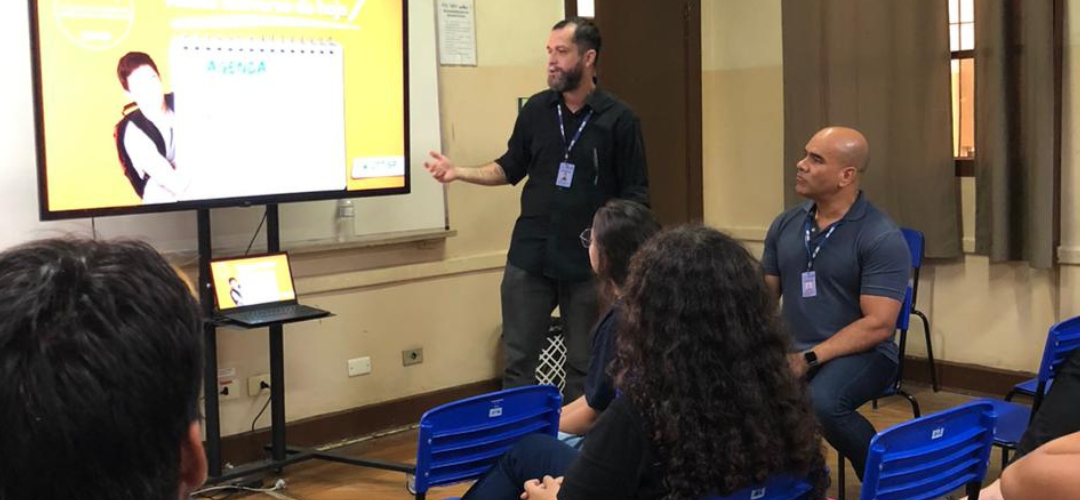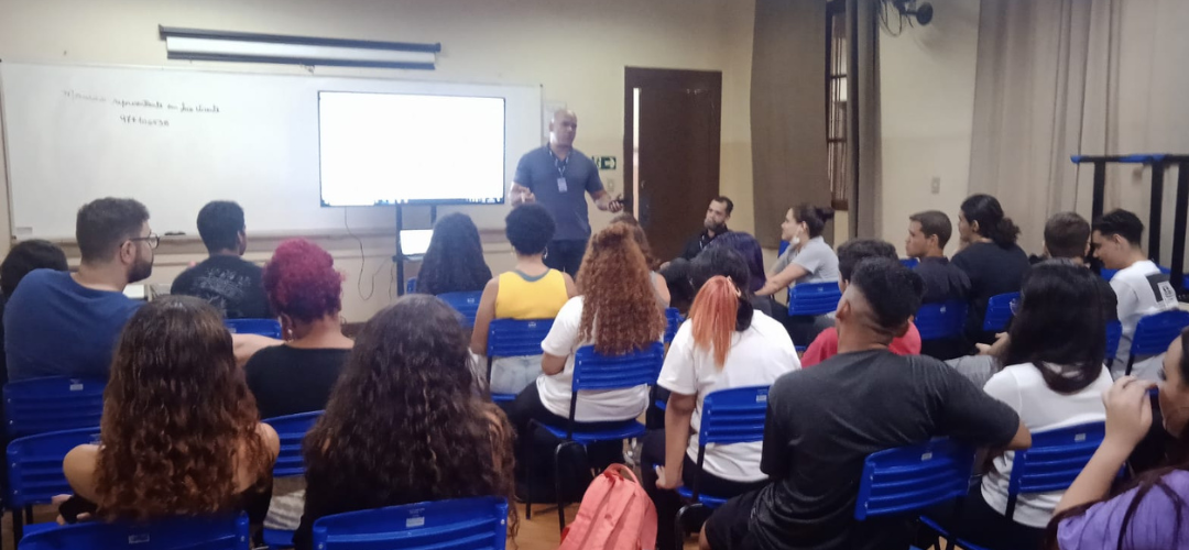 Representantes regionais do CRT-SP ministrando palestra institucional orientativa na ETEC Dra. Ruth Cardoso, em São Vicente
