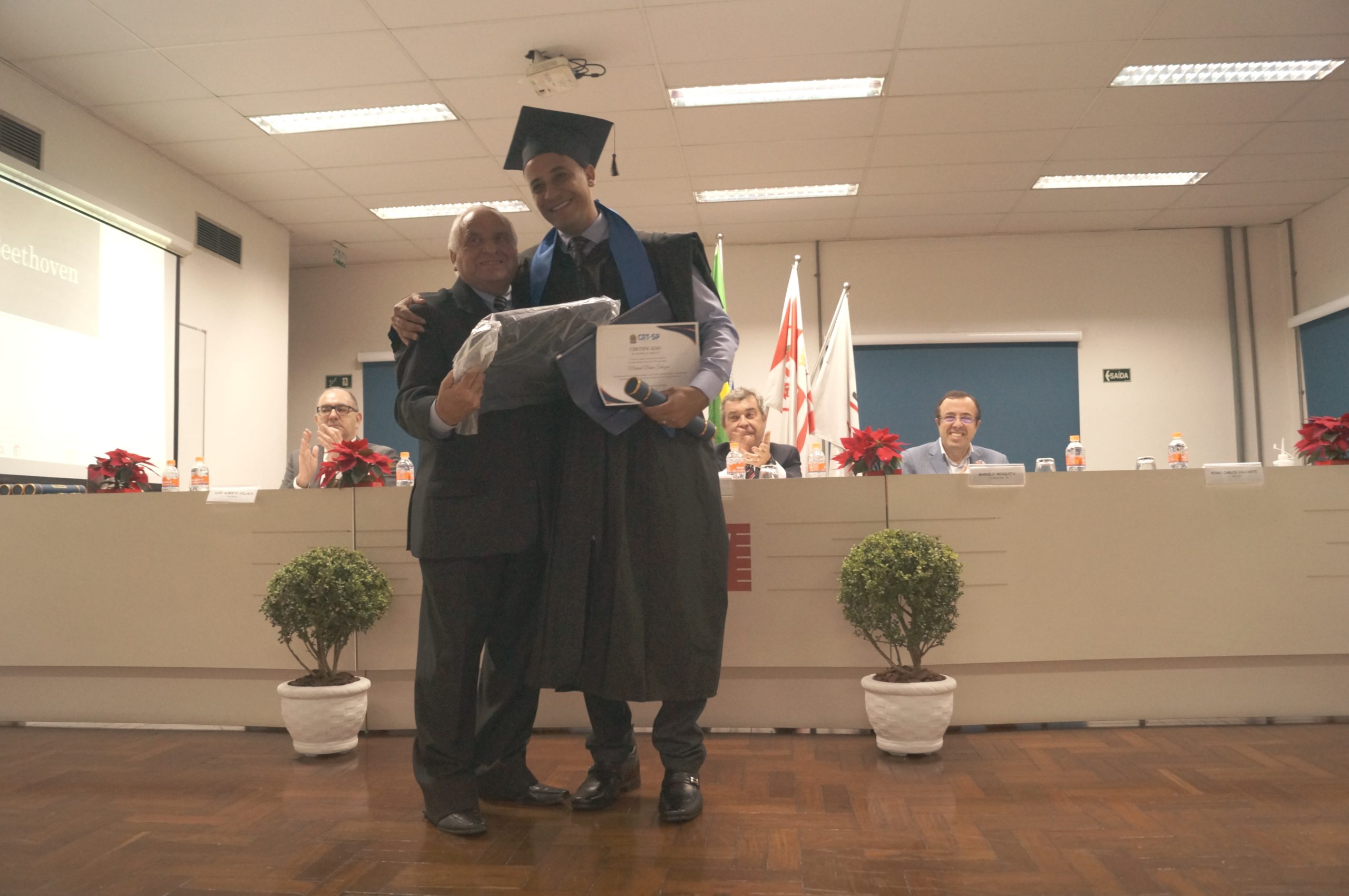 Pedro Carlos Valcante agradeceu o convite do SENAI, exaltou o corpo docente e, parabenizando os recém-formados, lembrou da importância do registro no conselho para a atuação legal da atividade, no intuito de valorizar a profissão técnica e defender a sociedade. “O CRT-SP é o conselho que fiscaliza e orienta a profissão dos técnicos. É nesse conselho, para exercer atividades técnicas, que vocês deverão estar registrados”, disse, convidando os formandos conhecer a sede do CRT-SP. Diretor da escola, Eduardo Macedo Ferraz e Souza, agradeceu a presença do diretor na cerimônia de formatura, alegando estar ansioso por novas visitas do conselho.
