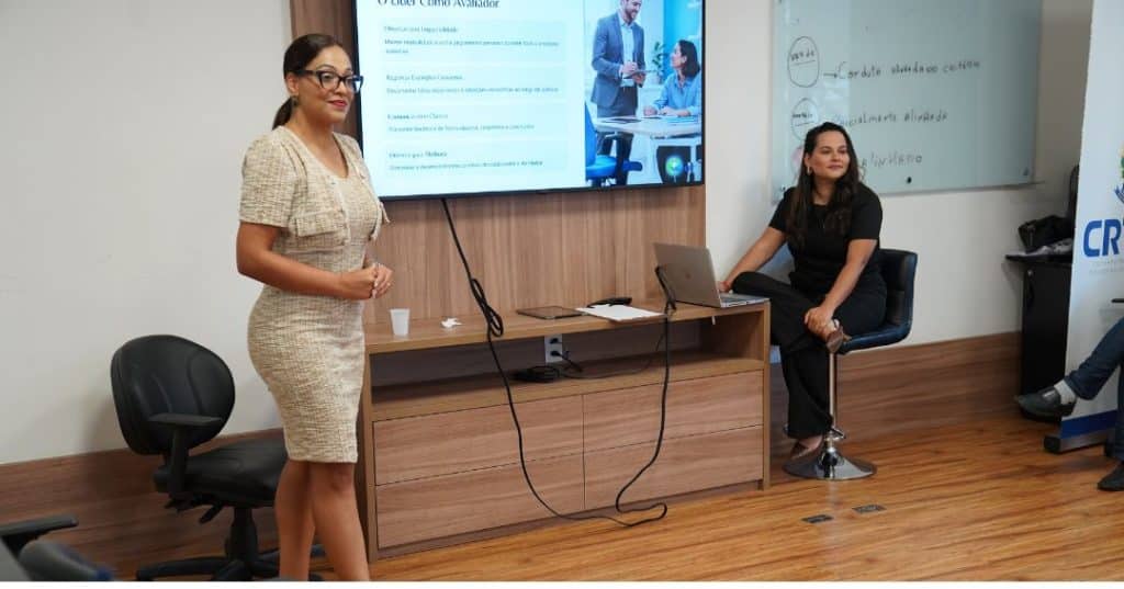 As consultoras também aplicaram um estudo de caso para avaliação de um colaborador fictício – mas recorrente em situações reais –, considerando que ele cumpre todos os requisitos profissionais técnicos de excelência no desempenho de suas funções; porém, com pontos fracos na comunicação interpessoal e no respeito aos colegas de trabalho. Divididos em duplas, os gestores e supervisores procederam com a avaliação, justificando as notas atribuídas e os feedbacks necessários.