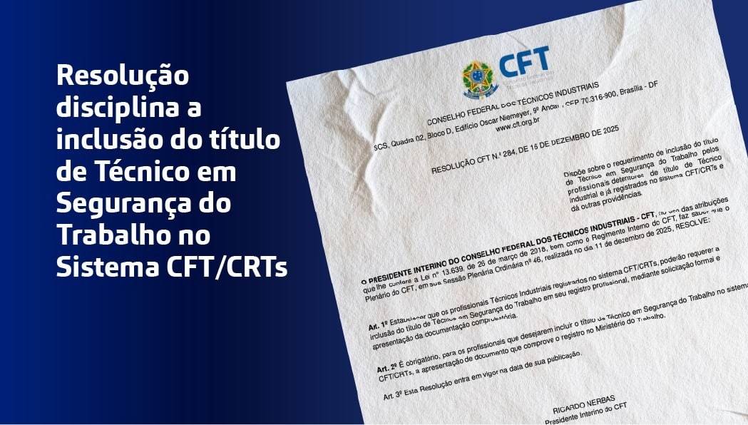 A Resolução CFT nº 284, de 16 de dezembro de 2025, publicada no Diário Oficial da União (DOU) em 23 de dezembro, estabelece critérios e procedimentos para a inclusão do título de Técnico em Segurança do Trabalho no registro de profissionais vinculados ao Sistema CFT/CRTs.
