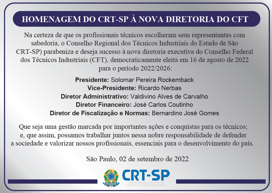 Na 21ª Sessão Plenária Extraordinária do  dia 1º de setembro de 2022 realizada na sede da Legião da Boa Vontade (LBV) em Brasília, o plenário do Conselho federal dos Técnicos Industriais (CFT) homologou o resultado das eleições complementares do Sistema CFT/CRT, realizadas no dia 16 de agosto de 2022, com vitória da Chapa nº 01 “CFT no Rumo Certo” para a diretoria executiva, composta por Solomar Pereira Rockembach como presidente, Ricardo Nerbas na vice-presidência, Valdivino Alves de Carvalho como diretor administrativo, José Carlos Coutinho como diretor financeiro, e Bernardino José Gomes no cargo de diretor de fiscalização e normas.