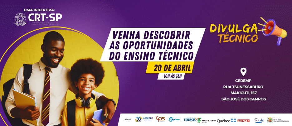 Com apoio da Secretaria de Educação e Cidadania de São José dos Campos e em parceria com as principais instituições de ensino técnico do estado e do país – Centro Paula Souza (CPS), instituto Federal de São Paulo (IFSP) e Serviço Nacional de Aprendizagem Industrial (SENAI-SP) –, o Conselho Regional dos Técnicos Industriais do Estado de São Paulo (CRT-SP) desenvolveu o Projeto Divulga Técnico: “As Oportunidades do Ensino Técnico”, que visa informar aos pais e responsáveis por estudantes sobre a importância dos cursos técnicos, que propiciam melhores oportunidades de emprego em mais de 90 modalidades diferentes.