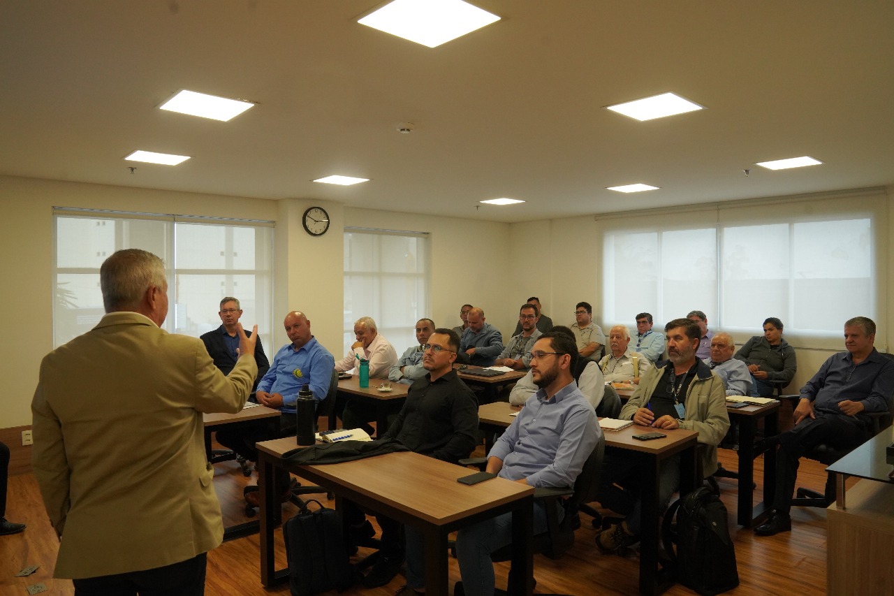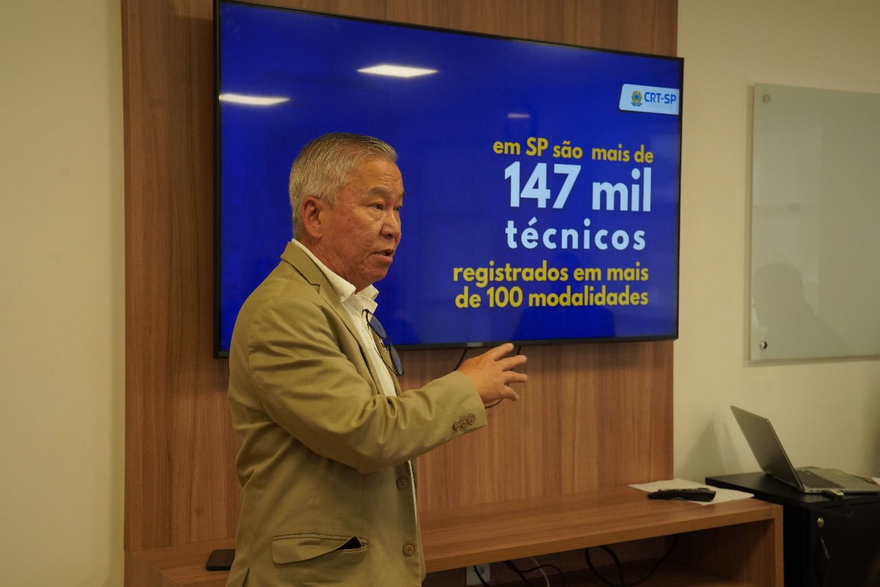 Gilberto Takao Sakamoto, presidente do CRT-SP, à frente da reunião realizada com profissionais técnicos, diretores e funcionários
