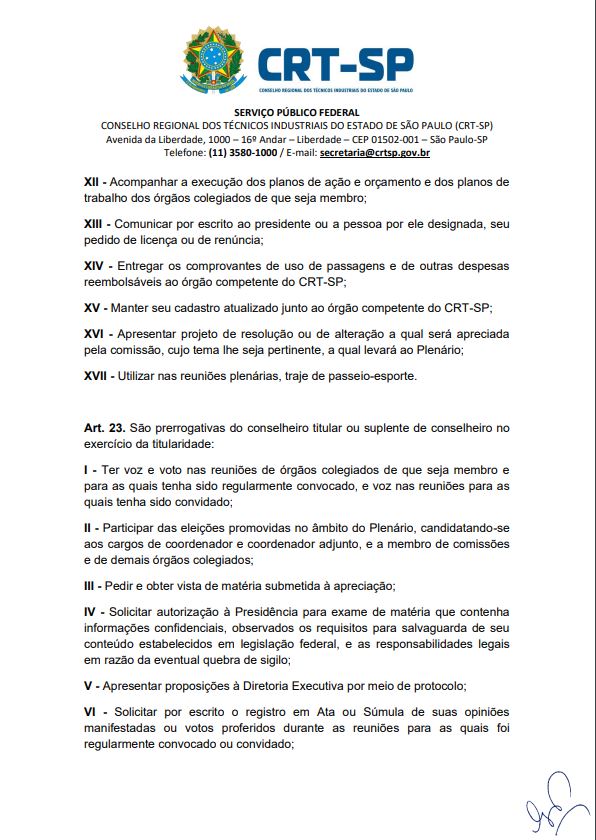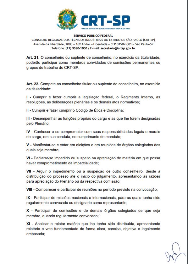Competências e prerrogativas dos conselheiros previstas no Regimento Interno, disponível na íntegra no Portal da Transparência do CRT-SP