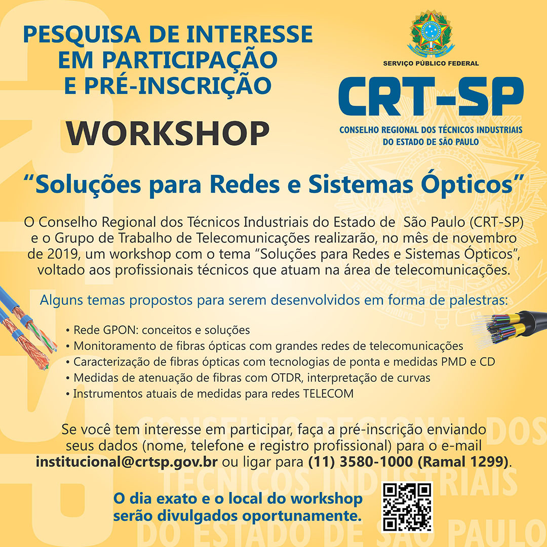 Com o apoio da equipe de comunicação do Conselho Regional dos Técnicos Industriais do Estado de São Paulo (CRT-SP), a pesquisa de interesse em participação no workshop voltado aos técnicos do setor de telecomunicações tem ganhado forma, e foi um dos assuntos abordados na reunião do Grupo de Trabalho de Telecomunicações realizada no dia 12 de setembro de 2019.